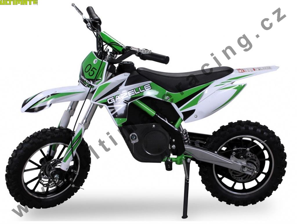 je nový model s elektromotorem o výkonu 500 W s neodymovým magnetem zaručující vysoké zrychlení na 25 km/h. Na rozdíl od motorek s benzínovým motorem ušitře čas na údržbě a neobtěžujete své okolí hlukem. Dětská elektrická motorka Gazelle 500W má 2 výkonné baterie 12V 12Ah, které zaručují dlouhý dojezd až 18km (dle zatížení a terénu) Perforované brzdové kotouče zaručující spolehlivý brzdný účinek, k výbavě motorky patří také zadní odpružení s nastavitelnou tuhostí, otočnou plynovou rukojeť s uzamčenou škrtící klapkou 25km/h - 15km/h - 7km/h dle dovedností uživatele.
